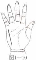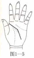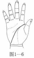 智慧线起自木星丘,倾斜到月丘处,且感情线浅而不清晰者、顽固(图1-6)