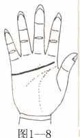 感情线特别长,达到木星丘边沿,精神过敏,从来不会真正相信别人真诚之言(图1-8)。