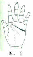智慧线突然下垂,早年重视实际行动,中年后重视精神生活(图1-5)